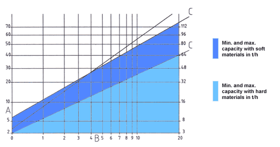 Feeding size | Space between roll faces | Capacity in t/h |